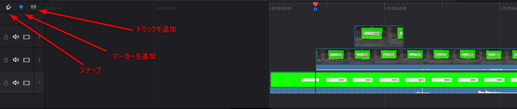 左側のアイコンONでメディアプールからタイムラインへクリップを入れるとビデオのみ入る。